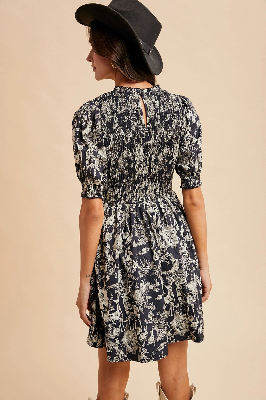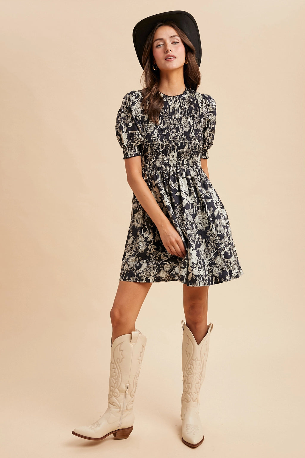 a dreamy little mini with a storybook print, smocked bodice, and puff sleeves. lined for comfort and finished with hidden pockets (because we all love them). dress it down with boots or elevate with strappy heels for dinner.