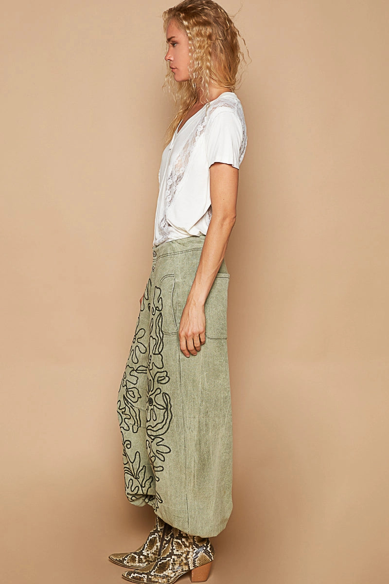 Your new favorite statement pant is here. These are crafted from sturdy 100% cotton twill and finished with playful, all-over embroidery that brings a one-of-a-kind edge. The relaxed fit, button-front detail, and elasticized hem keep them cool and wearable, while the floral doodle stitching makes them stand out.