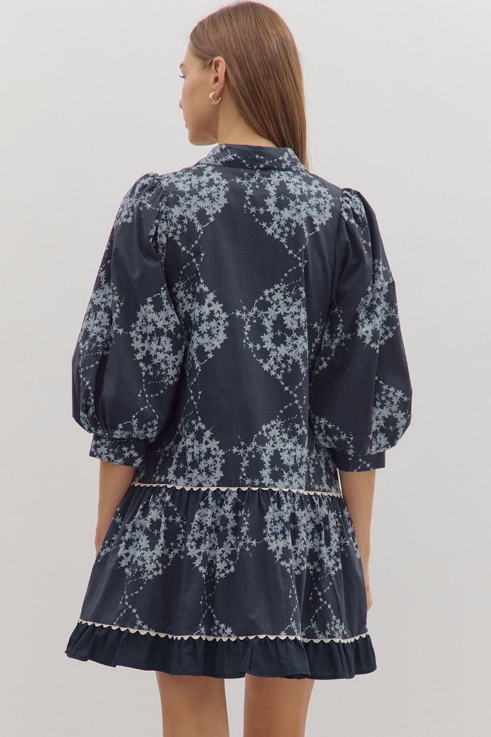 Navy cotton with a tiered silhouette, puff sleeves, and scalloped trim that’s basically made for brunches. Lightweight but polished, this dress is a closet MVP for when you want to look like you tried (but didn’t).