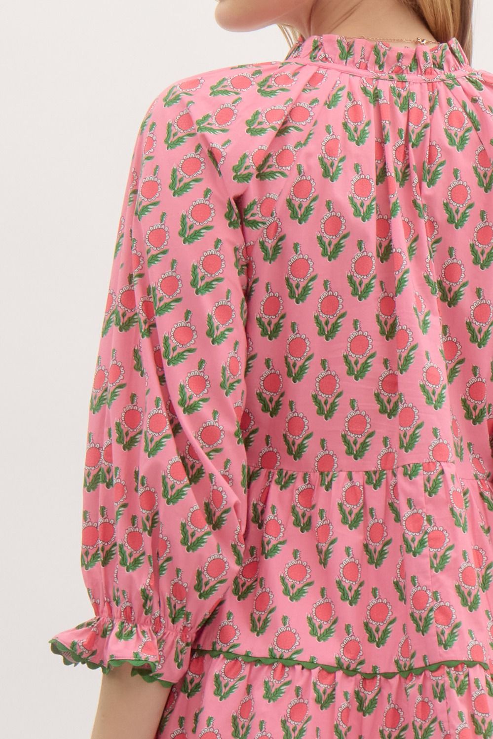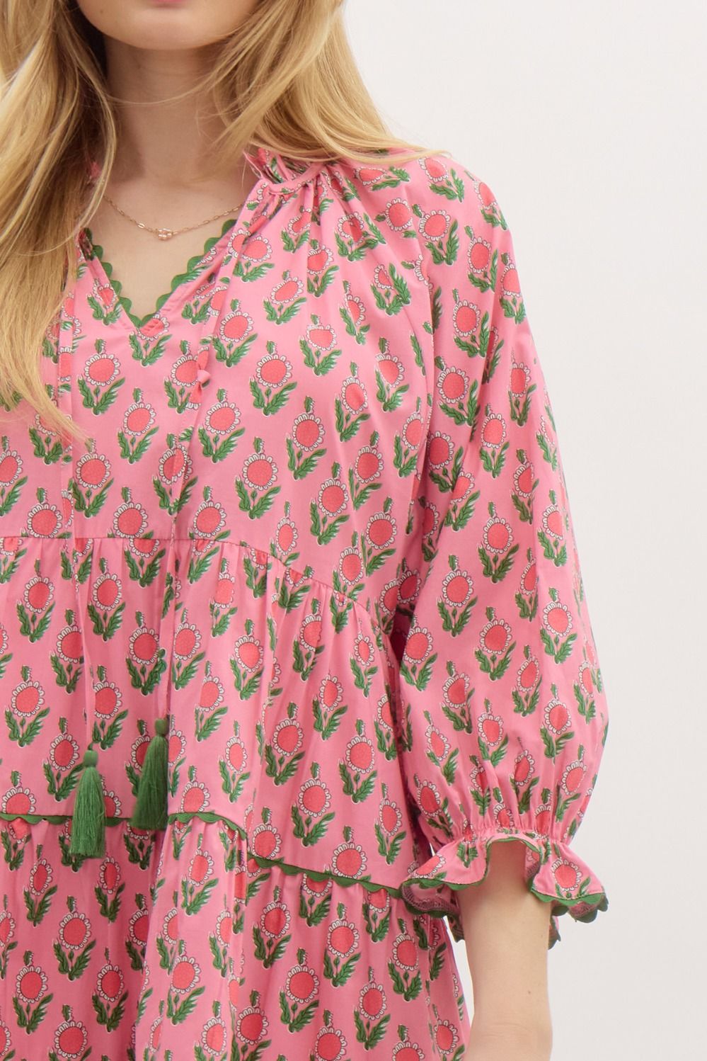 This playful Hill Country Dress with a pink floral print is perfect for any occasion. With its elastic ¾ sleeves and scallop trim inset, this tiered mini dress offers both comfort and style. And who doesn't love a dress with pockets? Made with lightweight, non-sheer woven cotton, this dress is perfect for all-day wear.