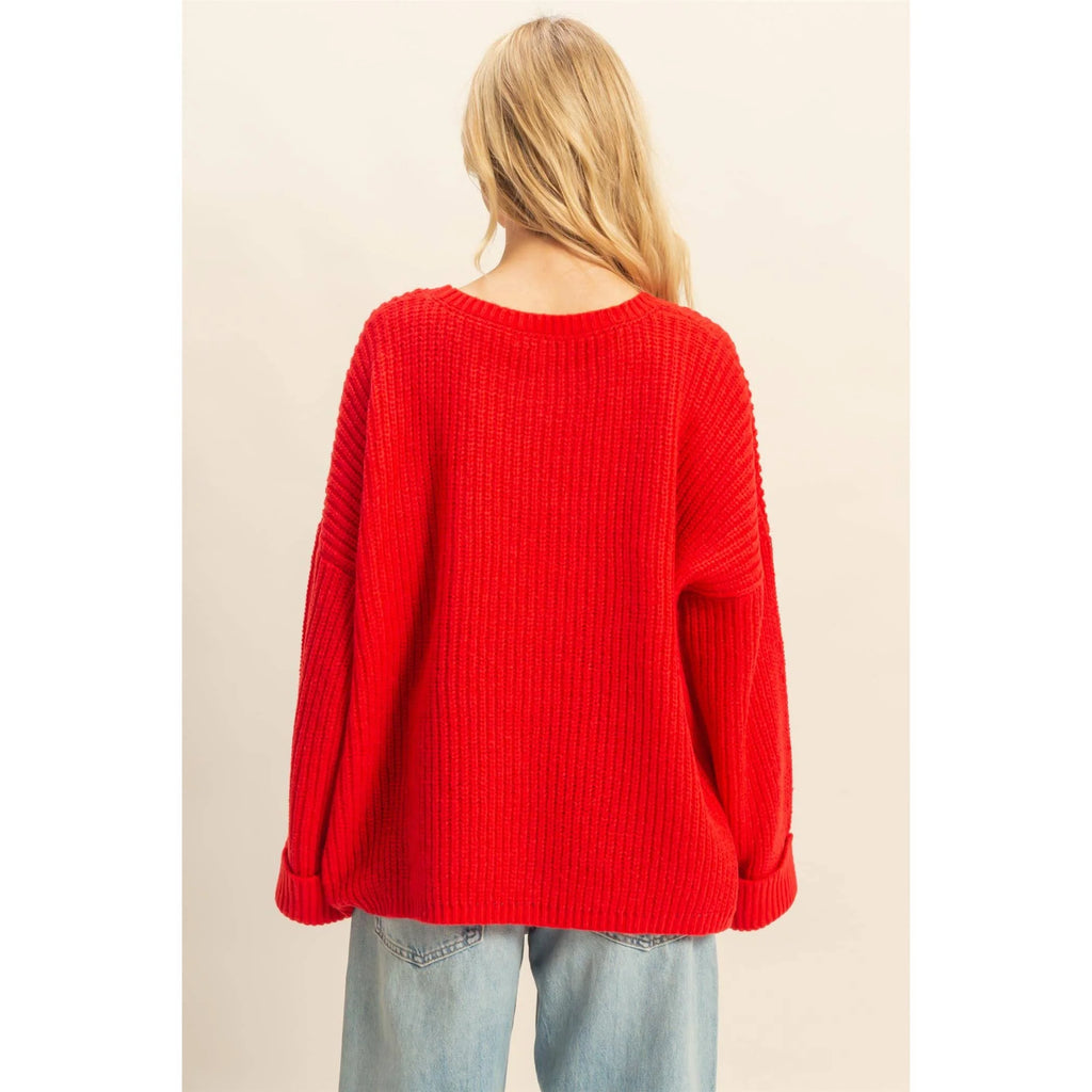 Cozy, slouchy, and made for everyday. The easy oversized sweater has that perfect throw-on-and-go fit — soft chunky knit, dropped shoulders, roomy sleeves with rolled cuffs, and a front pocket detail. Available in creamy ivory and bold cherry red, it’s the kind of sweater you’ll want in more than one color.